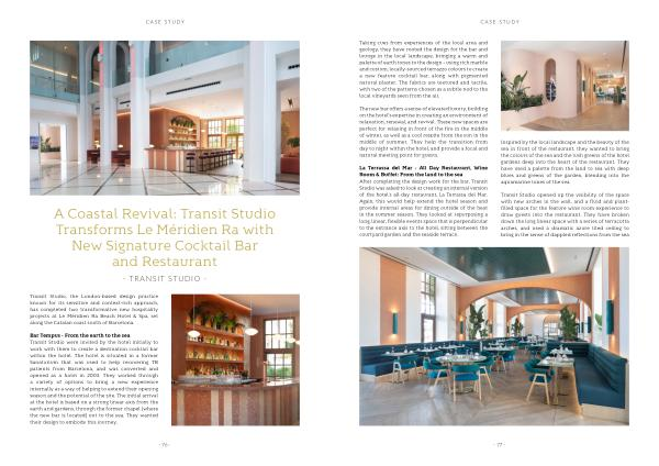 La Terrassa del Mar- All Day Restaurant, Wine Room & Buffet: From the land to the sea After completing the design work for the bar, Transit Studio was asked to look at creating an internal version of the hotel’ s all-day restaurant, La Terrassa del Mar. Again, this would help extend the hotel season and provide internal areas for dining outside of the heat in the summer season. They looked at repurposing a long, linear, flexible events space that is perpendicular to the entrance axis to the hotel, sitting between the courtyard garden and the seaside terrace.