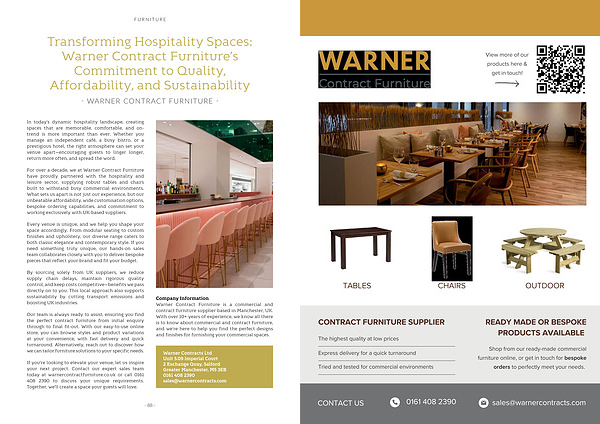 Company Information Warner Contract Furniture is a commercial and contract furniture supplier based in Manchester, UK. With over 10 + years of experience, we know all there is to know about commercial and contract furniture, and we’ re here to help you find the perfect designs and finishes for furnishing your commercial spaces.