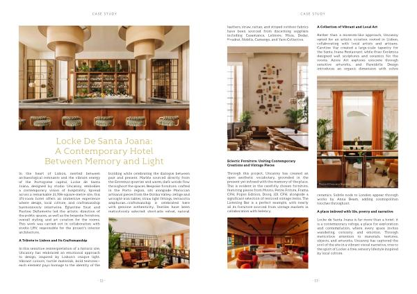 In the heart of Lisbon, nestled between archaeological remnants and the vibrant energy of the Portuguese capital, Locke de Santa Joana, designed by studio Uncanny, embodies a contemporary vision of hospitality. Spread across a remarkable 21,706-square-metre site, this 371-room hotel offers an immersive experience where design, local culture, and craftsmanship harmoniously intertwine. Églantine Sicat and Pauline Dellemotte led the artistic direction of the public spaces, as well as the bespoke furniture, overall styling, and art curation for the rooms. This work was carried out in collaboration with studio LRV, responsible for the project’ s interior architecture. building while celebrating the dialogue between past and present. Marble sourced directly from the Estremoz quarries and warm, dark woods flow throughout the spaces. Bespoke furniture, crafted in the Porto region, sits alongside Moroccan artisanal pieces from the Ourika Valley: zellige and wrought-iron tables, straw light fittings, terracotta amphorae … craftsmanship is celebrated here with genuine authenticity. Textiles have been meticulously selected: short-pile velvet, natural