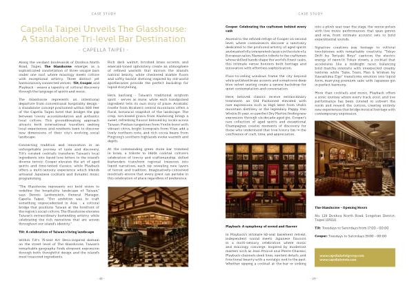 “ The Glasshouse represents our bold vision to redefine the hospitality landscape of Taiwan,” says Dennis Laubenstein, General Manager, Capella Taipei.“ Our ambition was to craft something unprecedented in Asia- a cultural bridge that positions Taiwan at the forefront of the region’ s social culture. The Glasshouse elevates Taiwan’ s extraordinary bartending artistry while celebrating the rich narratives that are woven throughout our island’ s identity.”