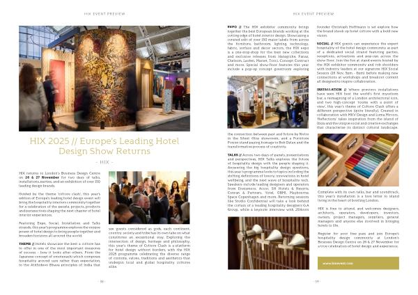 TALKS // Across two days of panels, presentations and perspectives, HIX Talks explores the future of hospitality design with the people shaping it. Answering the big hospitality design questions, this year’ s programme looks to topics including the shifting definitions of luxury, innovations in hotel wellbeing, and the next wave of hospitality tech. Speakers include leading designers and operators from Ennismore, Accor, SH Hotels & Resorts, Conran & Partners, Yotel, OBMI, Maybourne, Space Copenhagen and more. Returning sessions like Studio Confidential will take a look behind the curtain of a leading hospitality designers G. A Group, while a keynote interview with 25Hours