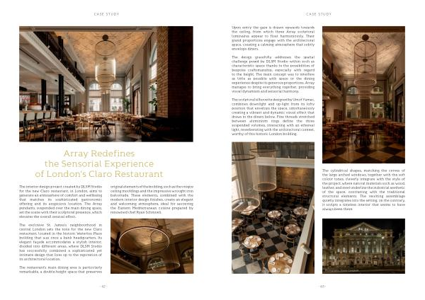 The interior design project created by DLSM Studio for the new Claro restaurant, in London, aims to generate an atmosphere of comfort and wellbeing that matches its sophisticated gastronomic offering and its auspicious location. The Array pendants, suspended over the main dining space, set the scene with their sculptural presence, which elevates the overall sensual effect. original elements of the building, such as the unique ceiling mouldings and the impressive wrought iron balustrade. These elements, combined with the modern interior design finishes, create an elegant and welcoming atmosphere, ideal for savouring the Eastern Mediterranean cuisine prepared by renowned chef Ryan Schmueli.