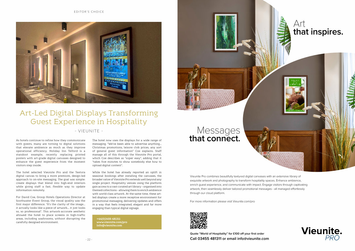 While the hotel has already reported an uplift in seasonal bookings after installing the canvases, the broader value of Vieunite Pro extends well beyond any single project. Hospitality venues using the platform gain access to a vast curated art library – organised into themed collections – allowing them to enrich ambience with world-class artwork. At the same time, these artled displays create a more receptive environment for promotional messaging, delivering updates and offers in a way that feels integrated, elegant and far more engaging than typical digital signage.