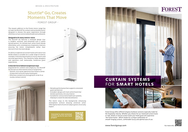 Forest Group offers different drapery hardware solutions especially made for the hospitality industry. Whether you choose for our motorised curtain tracks or rods, blinds or manual curtain tracks your hotel guest will experience‘ the Forest Factor’. Which stands for a unique combination of smooth hanging curtains, comfortable luxury and optimal ease of use.