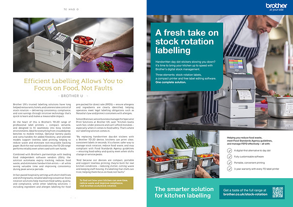 Simon Brennan, senior business manager for Specialist Print Solutions at Brother UK, said:“ Kitchen teams work fast, under pressure and can’ t afford mistakes – especially when it comes to food safety. That’ s where our labelling solution comes in.