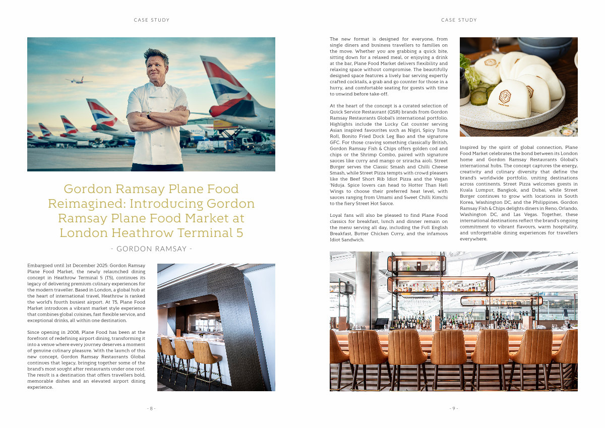Inspired by the spirit of global connection, Plane Food Market celebrates the bond between its London home and Gordon Ramsay Restaurants Global’ s international hubs. The concept captures the energy, creativity and culinary diversity that define the brand’ s worldwide portfolio, uniting destinations across continents. Street Pizza welcomes guests in Kuala Lumpur, Bangkok, and Dubai, while Street Burger continues to grow with locations in South Korea, Washington DC, and the Philippines. Gordon Ramsay Fish & Chips delights diners in Reno, Orlando, Washington DC, and Las Vegas. Together, these international destinations reflect the brand’ s ongoing commitment to vibrant flavours, warm hospitality, and unforgettable dining experiences for travellers everywhere.