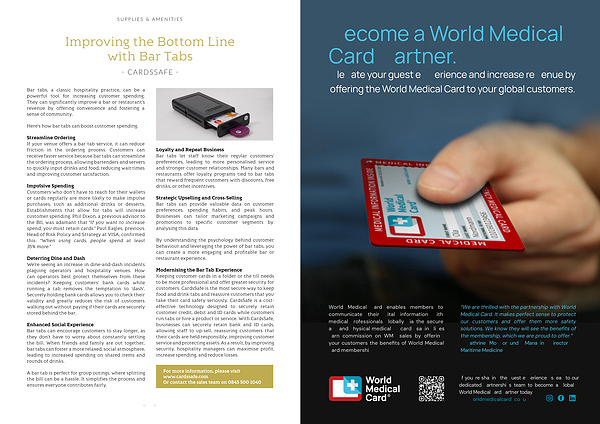 Modernising the Bar Tab Experience Keeping customer cards in a folder or the till needs to be more professional and offer greater security for customers. CardsSafe is the most secure way to keep food and drink tabs and reassure customers that you take their card safety seriously. CardsSafe is a costeffective technology designed to securely retain customer credit, debit and ID cards while customers run tabs or hire a product or service. With CardsSafe, businesses can securely retain bank and ID cards, allowing staff to up-sell, reassuring customers that their cards are held responsibly, improving customer service and protecting assets. As a result, by improving security, hospitality managers can maximise profit, increase spending, and reduce losses.