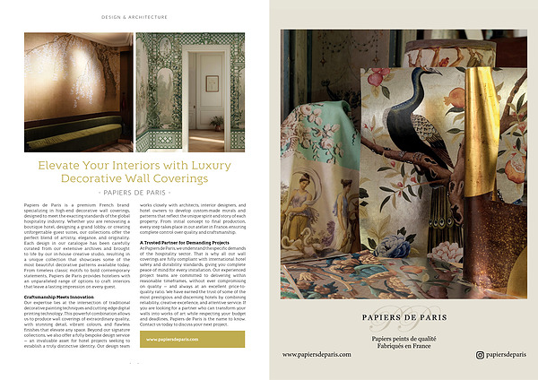 A Trusted Partner for Demanding Projects At Papiers de Paris, we understand the specific demands of the hospitality sector. That is why all our wall coverings are fully compliant with international hotel safety and durability standards, giving you complete peace of mind for every installation. Our experienced project teams are committed to delivering within reasonable timeframes, without ever compromising on quality— and always at an excellent price-toquality ratio. We have earned the trust of some of the most prestigious and discerning hotels by combining reliability, creative excellence, and attentive service. If you are looking for a partner who can transform your walls into works of art while respecting your budget and deadlines, Papiers de Paris is the name to know. Contact us today to discuss your next project.
