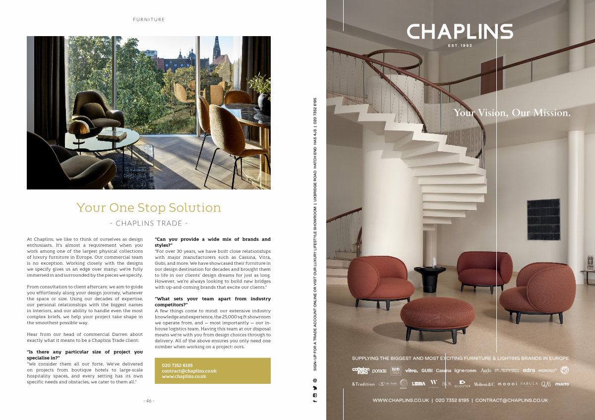 At Chaplins, we like to think of ourselves as design enthusiasts. It’ s almost a requirement when you work among one of the largest physical collections of luxury furniture in Europe. Our commercial team is no exception. Working closely with the designs we specify gives us an edge over many; we’ re fully immersed in and surrounded by the pieces we specify.