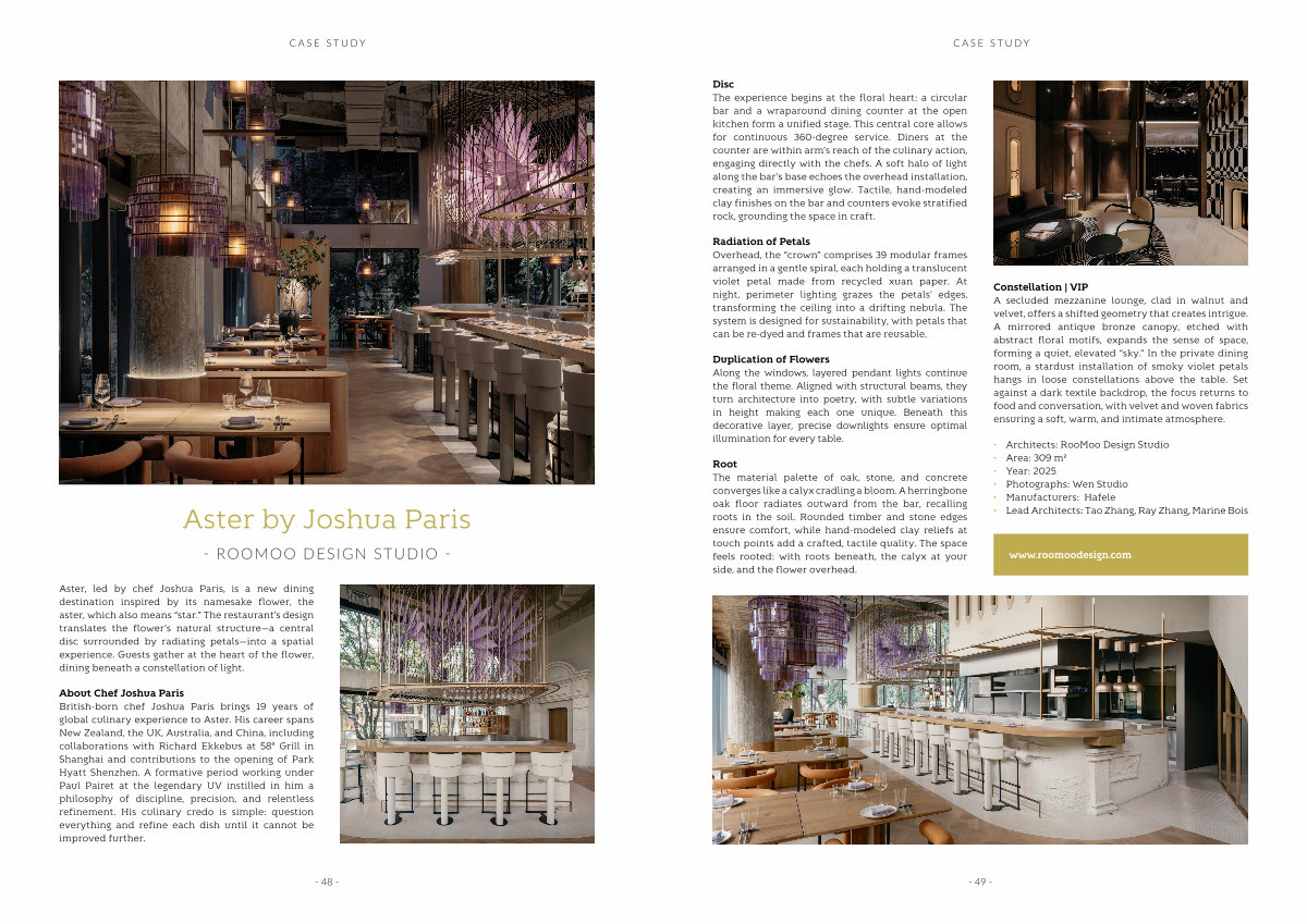Radiation of Petals Overhead, the“ crown” comprises 39 modular frames arranged in a gentle spiral, each holding a translucent violet petal made from recycled xuan paper. At night, perimeter lighting grazes the petals’ edges, transforming the ceiling into a drifting nebula. The system is designed for sustainability, with petals that can be re-dyed and frames that are reusable.