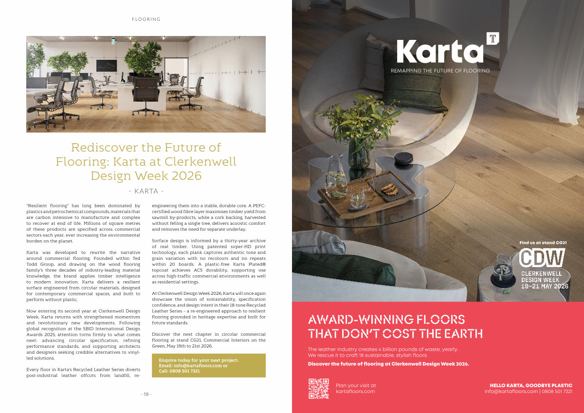 Now entering its second year at Clerkenwell Design Week, Karta returns with strengthened momentum and revolutionary new developments. Following global recognition at the SBID International Design Awards 2025, attention turns firmly to what comes next: advancing circular specification, refining performance standards, and supporting architects and designers seeking credible alternatives to vinylled solutions.