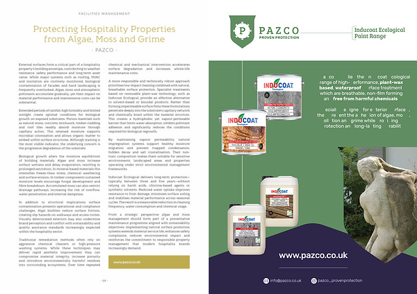 Pazco supplies the Inducoat Ecological range of high-performance, plant-wax based, waterproof surface treatments which are breathable, non-film forming and free from harmful chemicals.