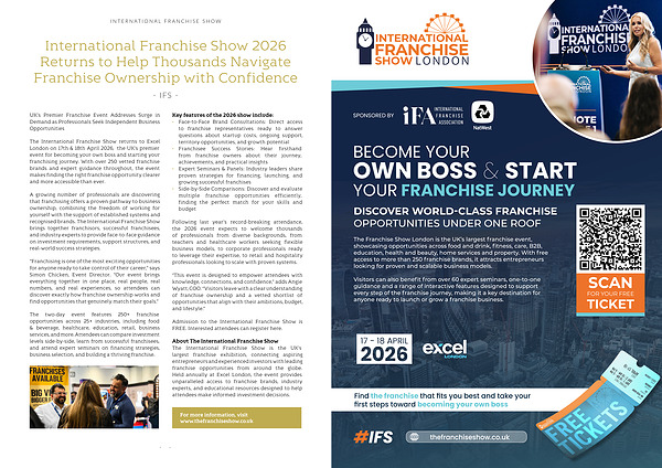 The International Franchise Show returns to Excel London on 17th & 18th April 2026, the UK’ s premier event for becoming your own boss and starting your franchising journey. With over 250 vetted franchise brands and expert guidance throughout, the event makes finding the right franchise opportunity clearer and more accessible than ever.