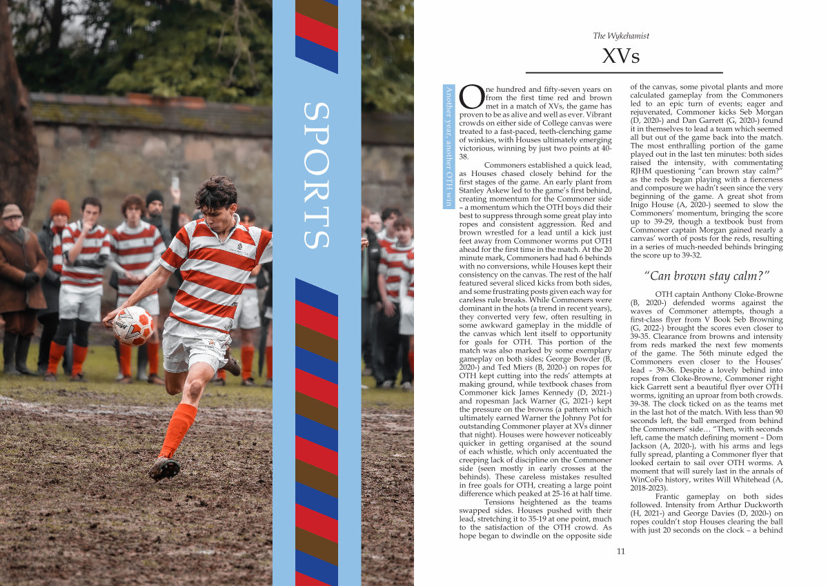 One hundred and fifty-seven years on from the first time red and brown met in a match of XVs, the game has proven to be as alive and well as ever. Vibrant crowds on either side of College canvas were treated to a fast-paced, teeth-clenching game of winkies, with Houses ultimately emerging victorious, winning by just two points at 40- 38.