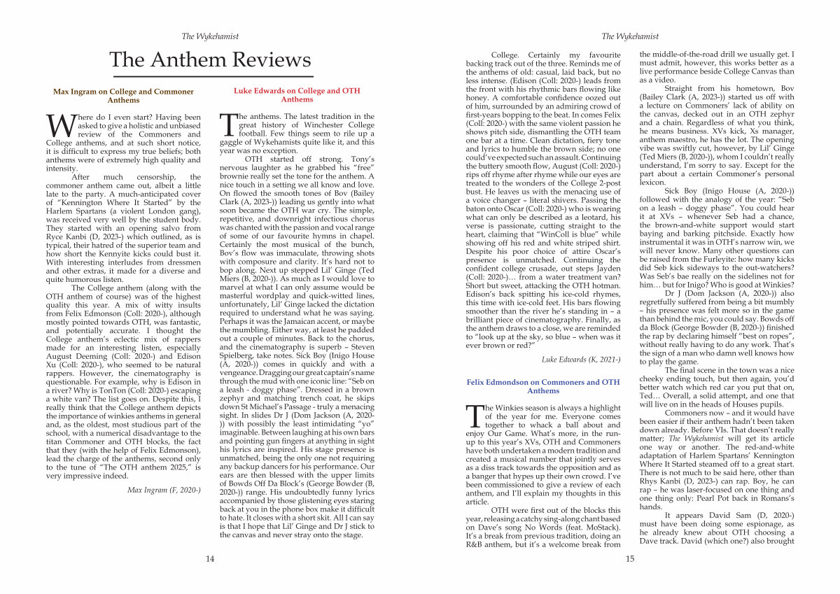 College. Certainly my favourite backing track out of the three. Reminds me of the anthems of old: casual, laid back, but no less intense.( Edison( Coll: 2020-) leads from the front with his rhythmic bars flowing like honey. A comfortable confidence oozed out of him, surrounded by an admiring crowd of first-years bopping to the beat. In comes Felix( Coll: 2020-) with the same violent passion he shows pitch side, dismantling the OTH team one bar at a time. Clean dictation, fiery tone and lyrics to humble the brown side; no one could’ ve expected such an assault. Continuing the buttery smooth flow, August( Coll: 2020-) rips off rhyme after rhyme while our eyes are treated to the wonders of the College 2-post bust. He leaves us with the menacing use of a voice changer – literal shivers. Passing the baton onto Oscar( Coll: 2020-) who is wearing what can only be described as a leotard, his verse is passionate, cutting straight to the heart, claiming that“ WinColl is blue” while showing off his red and white striped shirt. Despite his poor choice of attire Oscar’ s presence is unmatched. Continuing the confident college crusade, out steps Jayden( Coll: 2020-)… from a water treatment van? Short but sweet, attacking the OTH hotman. Edison’ s back spitting his ice-cold rhymes, this time with ice-cold feet. His bars flowing smoother than the river he’ s standing in – a brilliant piece of cinematography. Finally, as the anthem draws to a close, we are reminded to“ look up at the sky, so blue – when was it ever brown or red?”