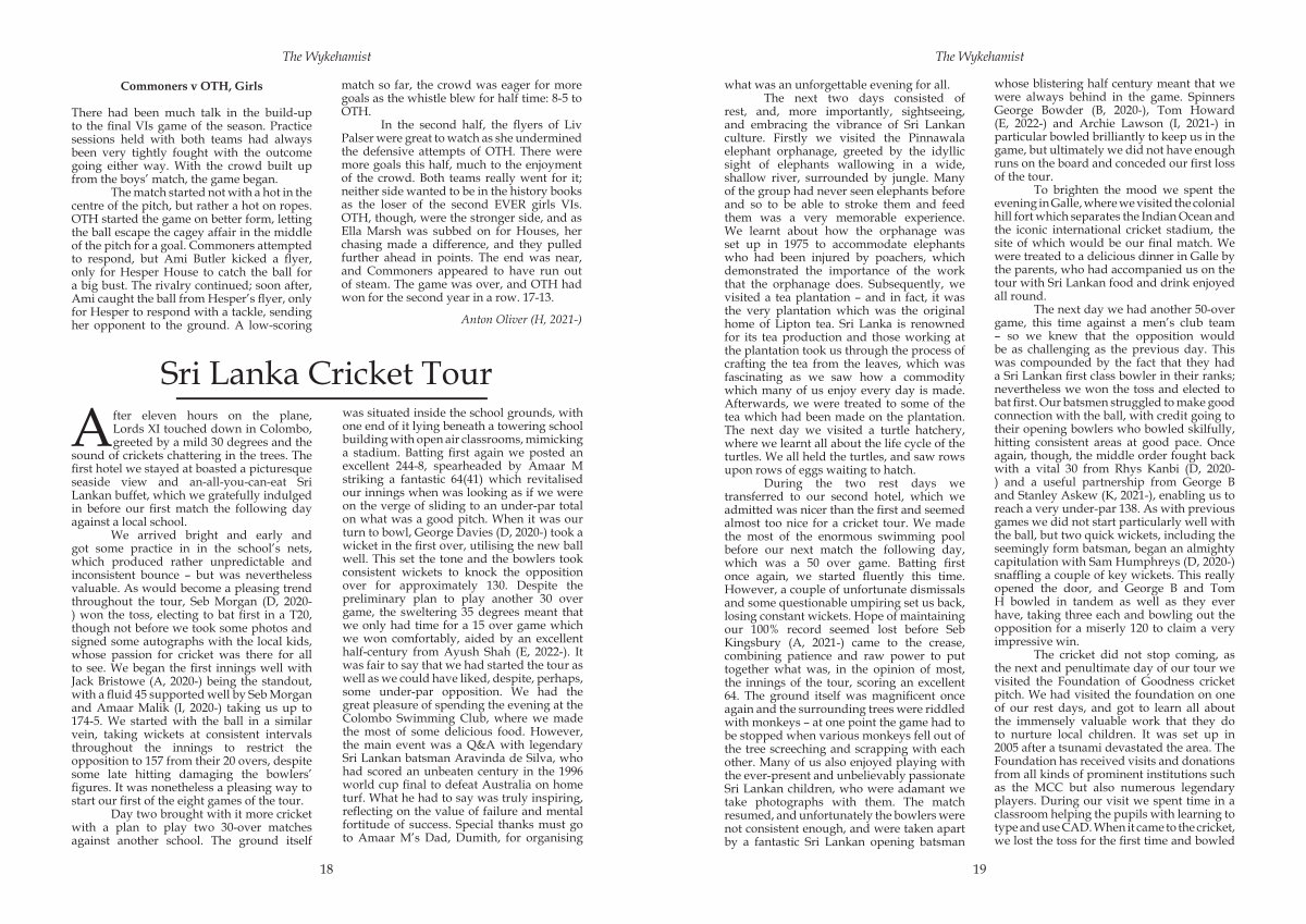 During the two rest days we transferred to our second hotel, which we admitted was nicer than the first and seemed almost too nice for a cricket tour. We made the most of the enormous swimming pool before our next match the following day, which was a 50 over game. Batting first once again, we started fluently this time. However, a couple of unfortunate dismissals and some questionable umpiring set us back, losing constant wickets. Hope of maintaining our 100 % record seemed lost before Seb Kingsbury( A, 2021-) came to the crease, combining patience and raw power to put together what was, in the opinion of most, the innings of the tour, scoring an excellent 64. The ground itself was magnificent once again and the surrounding trees were riddled with monkeys β at one point the game had to be stopped when various monkeys fell out of the tree screeching and scrapping with each other. Many of us also enjoyed playing with the ever-present and unbelievably passionate Sri Lankan children, who were adamant we take photographs with them. The match resumed, and unfortunately the bowlers were not consistent enough, and were taken apart by a fantastic Sri Lankan opening batsman whose blistering half century meant that we were always behind in the game. Spinners George Bowder( B, 2020-), Tom Howard( E, 2022-) and Archie Lawson( I, 2021-) in particular bowled brilliantly to keep us in the game, but ultimately we did not have enough runs on the board and conceded our first loss of the tour.