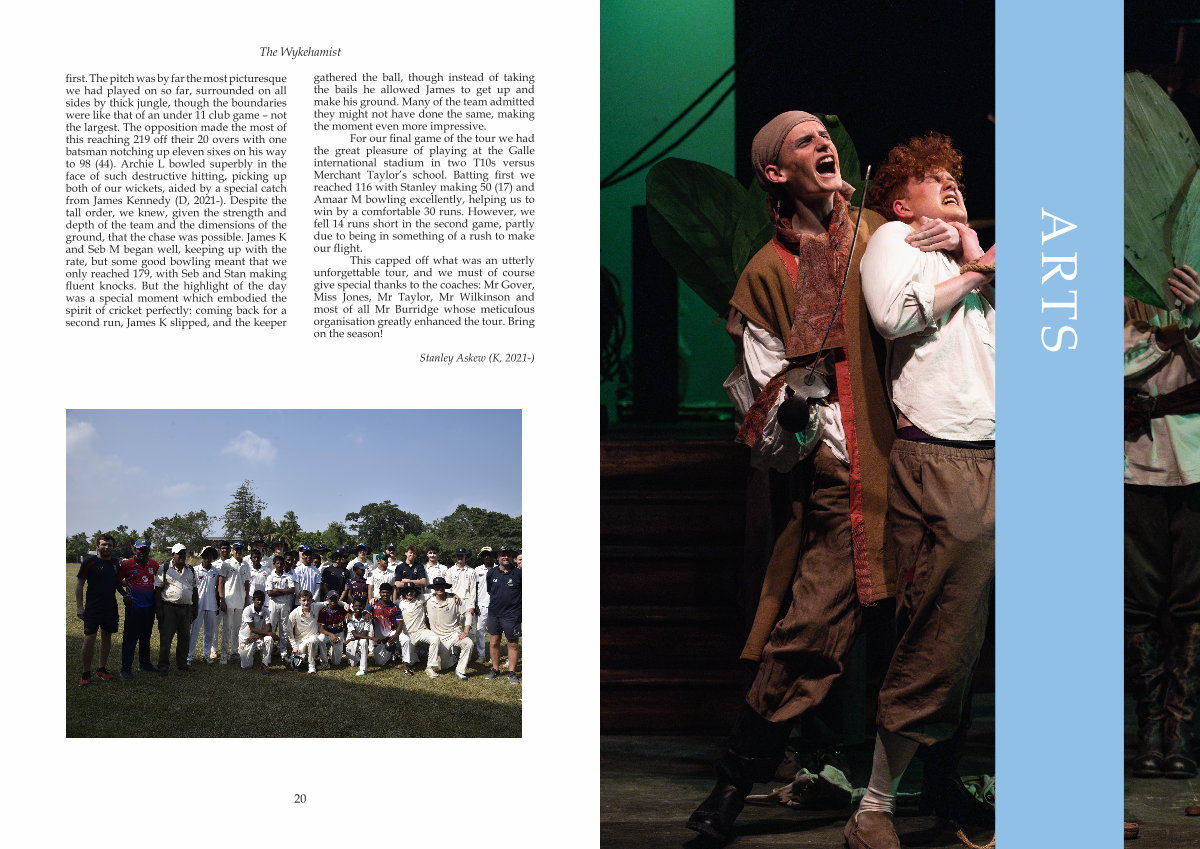 first. The pitch was by far the most picturesque we had played on so far, surrounded on all sides by thick jungle, though the boundaries were like that of an under 11 club game – not the largest. The opposition made the most of this reaching 219 off their 20 overs with one batsman notching up eleven sixes on his way to 98( 44). Archie L bowled superbly in the face of such destructive hitting, picking up both of our wickets, aided by a special catch from James Kennedy( D, 2021-). Despite the tall order, we knew, given the strength and depth of the team and the dimensions of the ground, that the chase was possible. James K and Seb M began well, keeping up with the rate, but some good bowling meant that we only reached 179, with Seb and Stan making fluent knocks. But the highlight of the day was a special moment which embodied the spirit of cricket perfectly: coming back for a second run, James K slipped, and the keeper gathered the ball, though instead of taking the bails he allowed James to get up and make his ground. Many of the team admitted they might not have done the same, making the moment even more impressive.