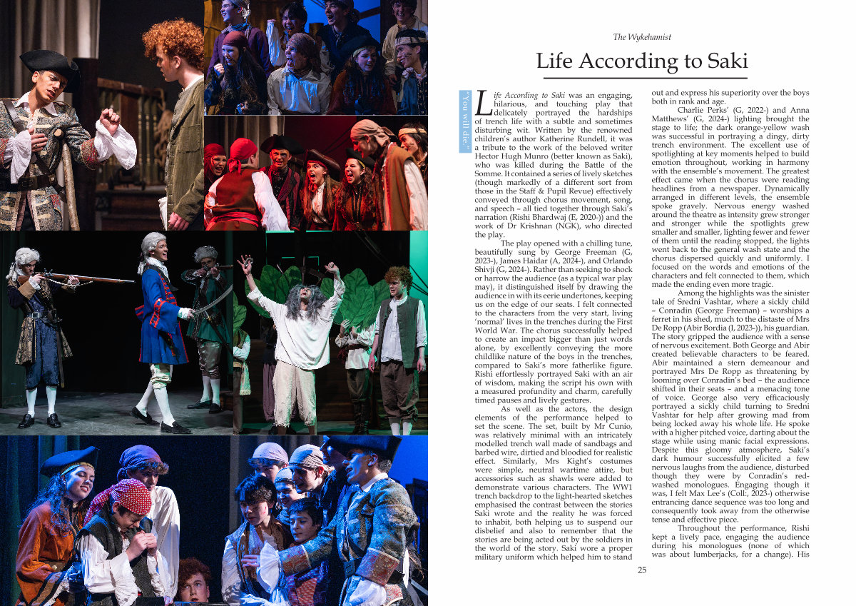Life According to Saki was an engaging, hilarious, and touching play that delicately portrayed the hardships of trench life with a subtle and sometimes disturbing wit. Written by the renowned children’ s author Katherine Rundell, it was a tribute to the work of the beloved writer Hector Hugh Munro( better known as Saki), who was killed during the Battle of the Somme. It contained a series of lively sketches( though markedly of a different sort from those in the Staff & Pupil Revue) effectively conveyed through chorus movement, song, and speech – all tied together through Saki’ s narration( Rishi Bhardwaj( E, 2020-)) and the work of Dr Krishnan( NGK), who directed the play.