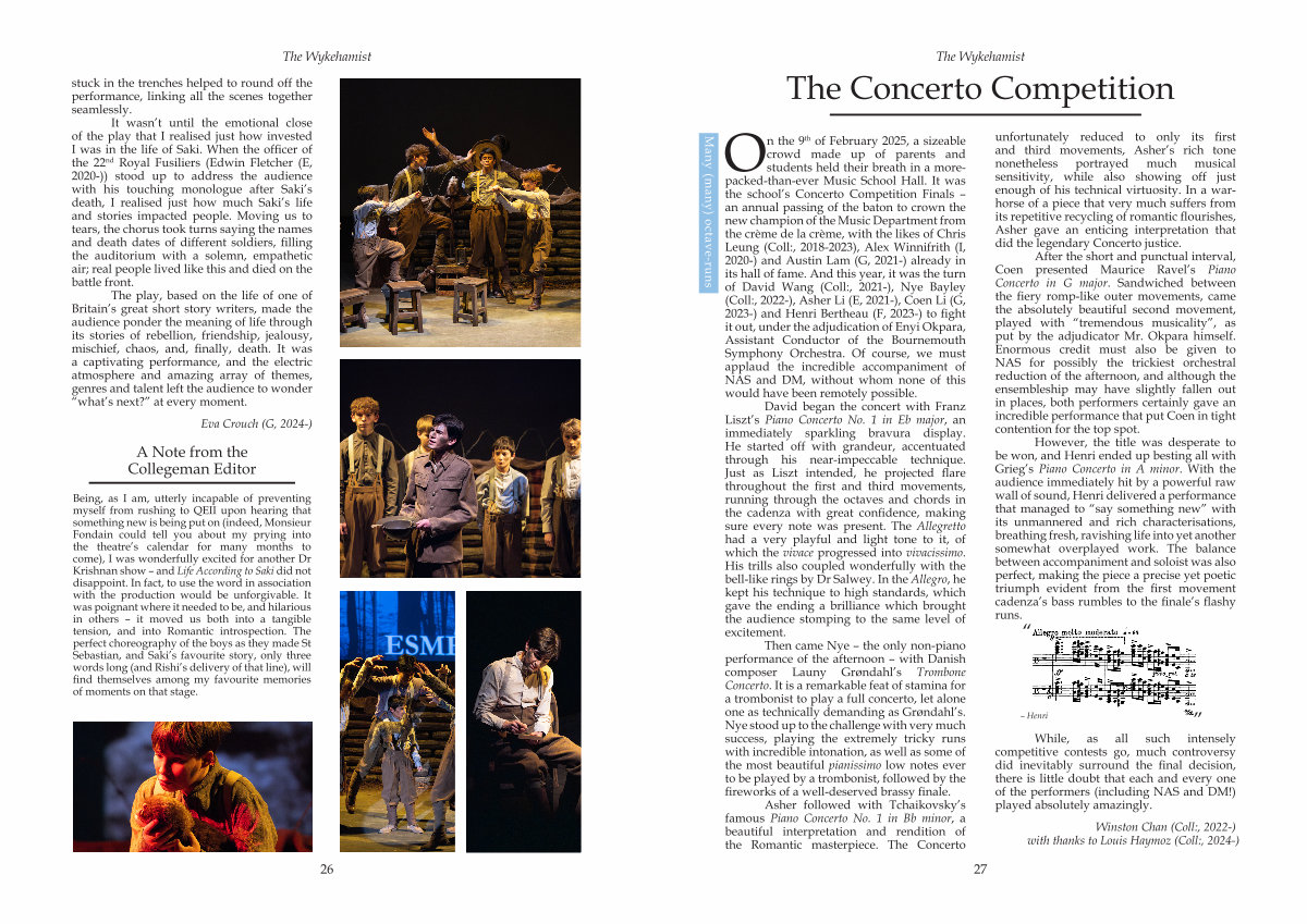 On the 9th of February 2025, a sizeable crowd made up of parents and students held their breath in a morepacked-than-ever Music School Hall. It was the school’ s Concerto Competition Finals – an annual passing of the baton to crown the new champion of the Music Department from the crème de la crème, with the likes of Chris Leung( Coll:, 2018-2023), Alex Winnifrith( I, 2020-) and Austin Lam( G, 2021-) already in its hall of fame. And this year, it was the turn of David Wang( Coll:, 2021-), Nye Bayley( Coll:, 2022-), Asher Li( E, 2021-), Coen Li( G, 2023-) and Henri Bertheau( F, 2023-) to fight it out, under the adjudication of Enyi Okpara, Assistant Conductor of the Bournemouth Symphony Orchestra. Of course, we must applaud the incredible accompaniment of NAS and DM, without whom none of this would have been remotely possible.