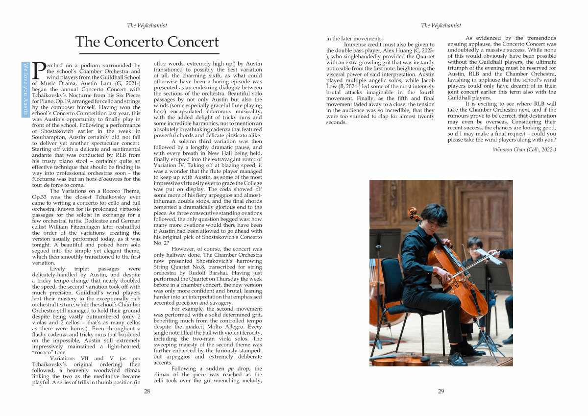 As evidenced by the tremendous ensuing applause, the Concerto Concert was undoubtedly a massive success. While none of this would obviously have been possible without the Guildhall players, the ultimate triumph of the evening must be reserved for Austin, RLB and the Chamber Orchestra, lavishing in applause that the school’ s wind players could only have dreamt of in their joint concert earlier this term also with the Guildhall players.