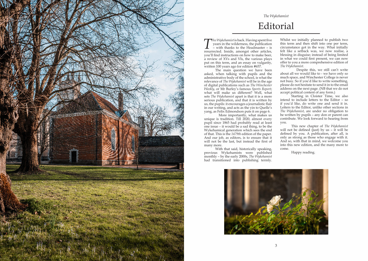 Whilst we initially planned to publish two this term and then shift into one per term, circumstance got in the way. What initially felt like a setback was, we now realise, a blessing in disguise; instead of being limited in what we could first present, we can now offer to you a more comprehensive edition of The Wykehamist.