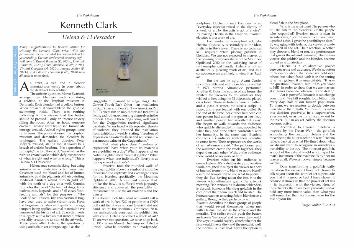 For works of conceptual art, like Helena, physicality is secondary to the ideas it elicits in the viewer. There is no technical skill required when placing goldfish in blenders. We are not expected to marvel at the pleasing hourglass shape of the Moulinex Optiblend 2000 or the satisfying curve of its hemispherical handle. Helena is not an aesthetically pleasing work of art, and as a consequence we are likely to view it as‘ bad’ art.