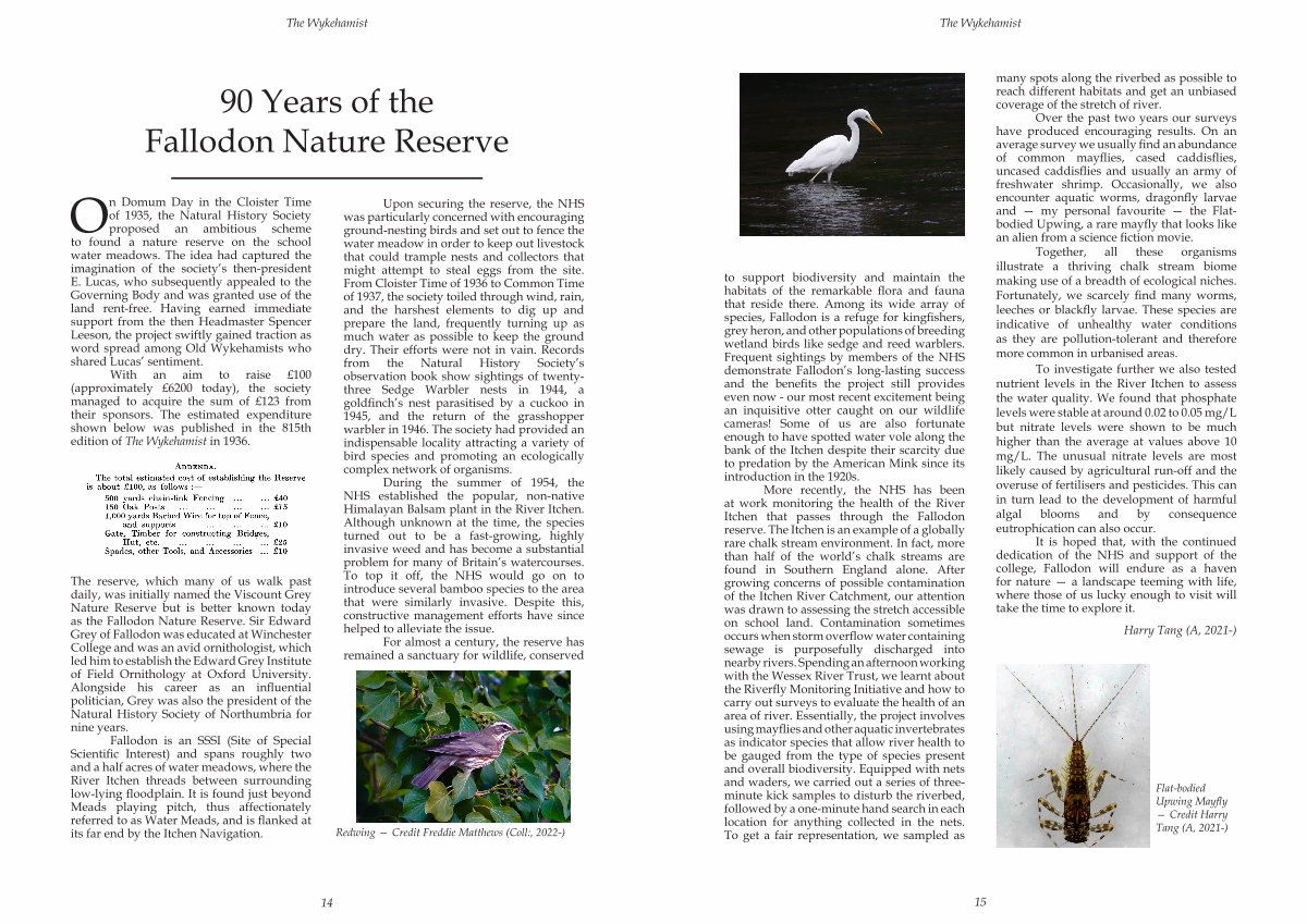 Upon securing the reserve, the NHS was particularly concerned with encouraging ground-nesting birds and set out to fence the water meadow in order to keep out livestock that could trample nests and collectors that might attempt to steal eggs from the site. From Cloister Time of 1936 to Common Time of 1937, the society toiled through wind, rain, and the harshest elements to dig up and prepare the land, frequently turning up as much water as possible to keep the ground dry. Their efforts were not in vain. Records from the Natural History Society’ s observation book show sightings of twentythree Sedge Warbler nests in 1944, a goldfinch’ s nest parasitised by a cuckoo in 1945, and the return of the grasshopper warbler in 1946. The society had provided an indispensable locality attracting a variety of bird species and promoting an ecologically complex network of organisms.