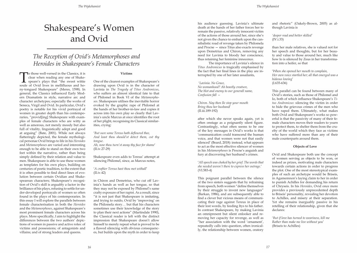 To those well-versed in the Classics, it is clear when reading any one of Shakespeare’ s plays that“ the sweet wittie soule of Ovid lives in mellifluous and hony-tongued Shakespeare”( Meres, 1598). In general, the Classics influenced Early Modern Dramatists in style, narrative arc and character archetypes; especially the works of Seneca, Virgil and Ovid. In particular, Ovid’ s poetry is notable for his vivid portrayal of women in greater depth than his contemporaries,“ provid [ ing ] Shakespeare with examples of female characters who are witty as well as amorous, not merely moody but also full of vitality, linguistically adept and good at arguing”( Bate, 2001). While not always flatteringly depicted, the female mythological personae Ovid brings to life in his Heroides and Metamorphoses are varied and interesting enough to be able to stand on their own two feet within the narrative, rather than being simply defined by their relation and value to men. Shakespeare is able to use these women as templates for his own plays, building on centuries of poetic tradition, to the extent that it is often possible to find direct lines of evolution between certain Ovidian and Shakespearean characters; Shakespeare’ s recognition of Ovid’ s skill is arguably a factor in the brilliance of his plays, refusing to settle for under-developed portrayals of women so often found in the plays of his contemporaries. In this essay I will explore the parallels between female characterisation in both the Heroides and the Metamorphoses, against Shakespeare’ s most prominent female characters across his plays. More specifically, I aim to highlight the differences between the two authors’ depictions of women in passive and active roles: of victims and possessions; of antagonists and villains; and of strong leaders and queens.