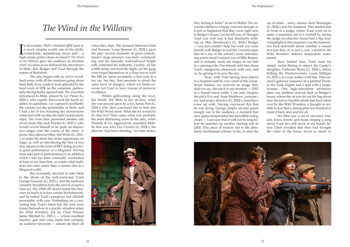 they belong in holes” to me in Maths! The encounter did have a happy outcome though, as it just so happened that they were right next to Badger’ s house. Let me tell you, if I thought Toad was well cast, it had absolutely nothing on Max Henderson’ s( G, 2024-) Badger— you just couldn’ t help but wish you were friends with Badger in real life. I would argue that he’ s one of the school’ s most entertaining actors( need I remind you of Billy Bones), and it certainly made me happy to see him in a starring role. Our friends told him about Toad’ s dangerous obesession with cars, and so, he sprung in to save the day.