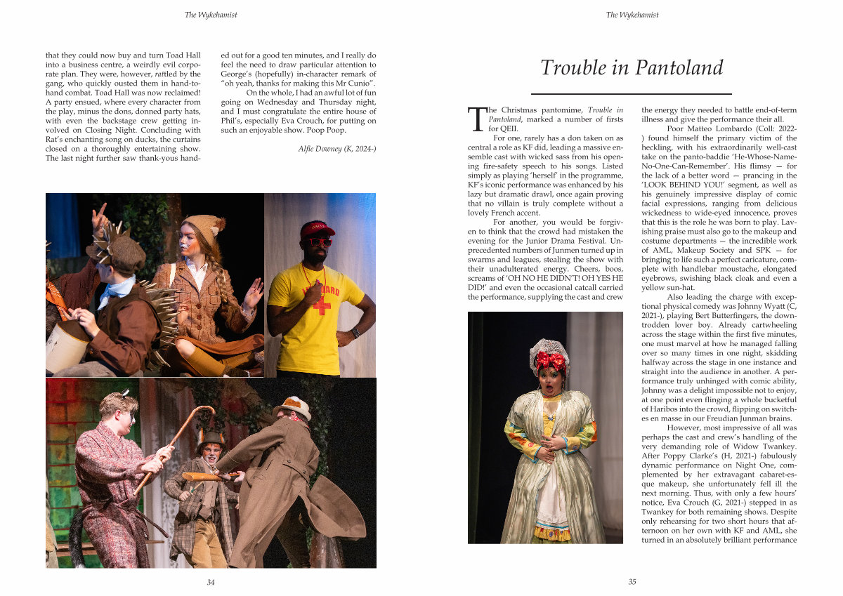 The Christmas pantomime, Trouble in Pantoland, marked a number of firsts for QEII. For one, rarely has a don taken on as central a role as KF did, leading a massive ensemble cast with wicked sass from his opening fire-safety speech to his songs. Listed simply as playing‘ herself’ in the programme, KF’ s iconic performance was enhanced by his lazy but dramatic drawl, once again proving that no villain is truly complete without a lovely French accent.
