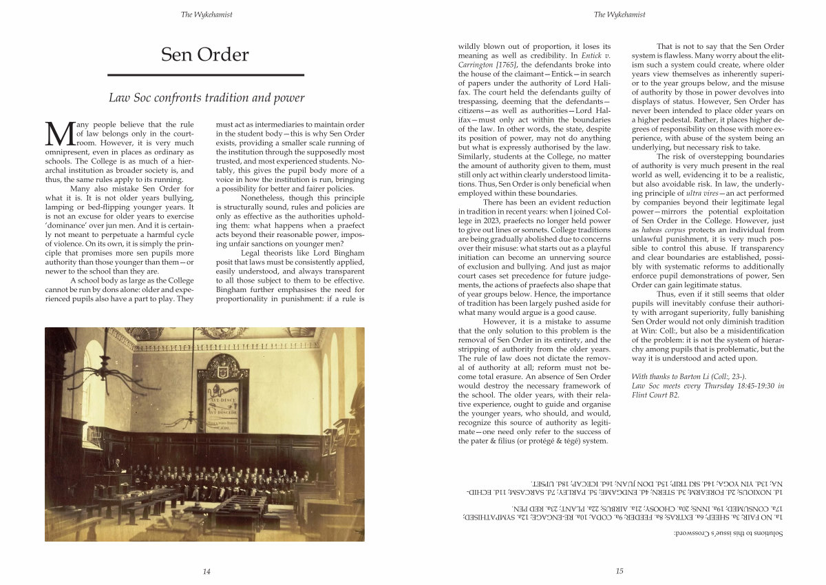 The risk of overstepping boundaries of authority is very much present in the real world as well, evidencing it to be a realistic, but also avoidable risk. In law, the underlying principle of ultra vires— an act performed by companies beyond their legitimate legal power— mirrors the potential exploitation of Sen Order in the College. However, just as habeas corpus protects an individual from unlawful punishment, it is very much possible to control this abuse. If transparency and clear boundaries are established, possibly with systematic reforms to additionally enforce pupil demonstrations of power, Sen Order can gain legitimate status.