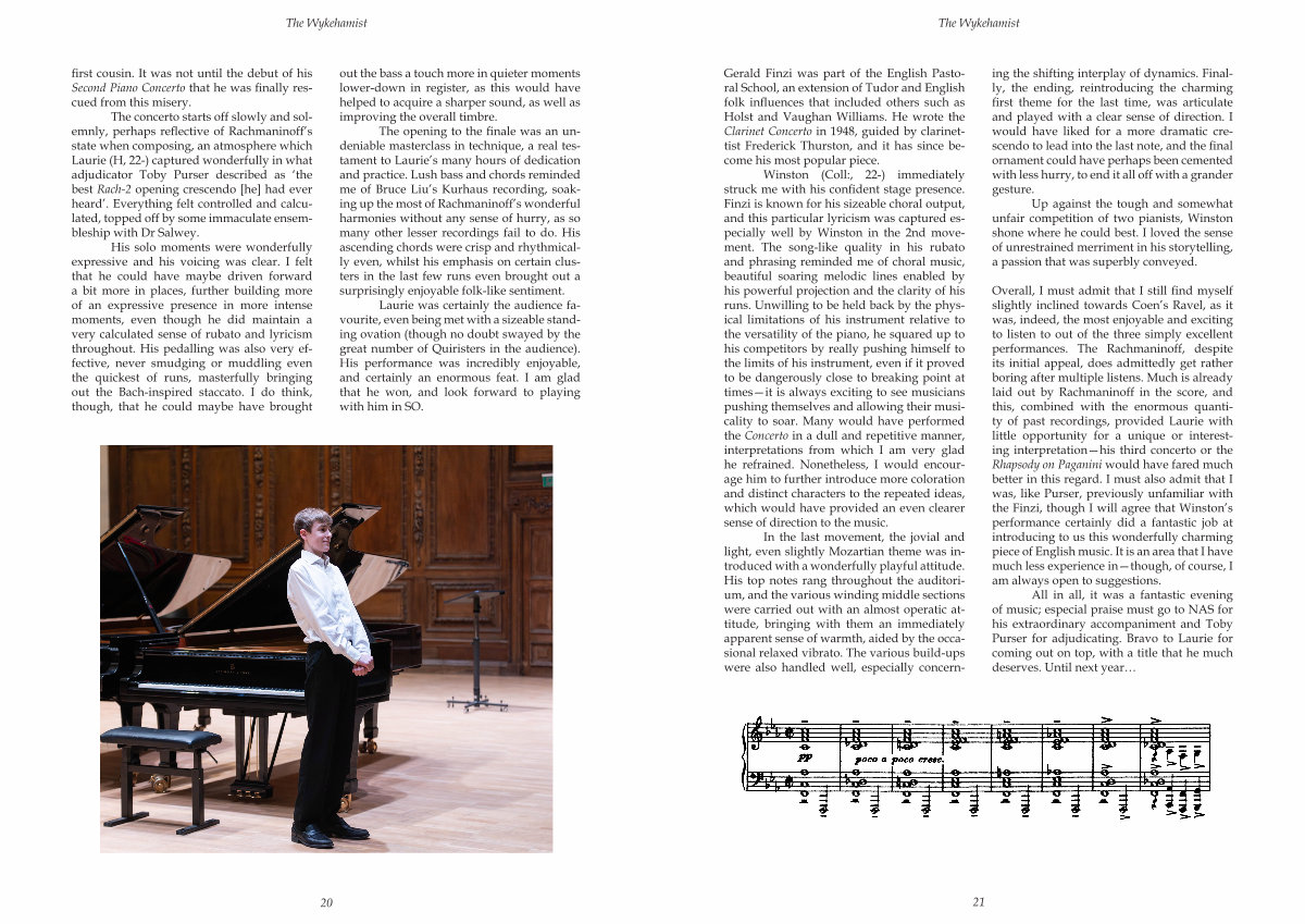 Winston( Coll:, 22-) immediately struck me with his confident stage presence. Finzi is known for his sizeable choral output, and this particular lyricism was captured especially well by Winston in the 2nd movement. The song-like quality in his rubato and phrasing reminded me of choral music, beautiful soaring melodic lines enabled by his powerful projection and the clarity of his runs. Unwilling to be held back by the physical limitations of his instrument relative to the versatility of the piano, he squared up to his competitors by really pushing himself to the limits of his instrument, even if it proved to be dangerously close to breaking point at times— it is always exciting to see musicians pushing themselves and allowing their musicality to soar. Many would have performed the Concerto in a dull and repetitive manner, interpretations from which I am very glad he refrained. Nonetheless, I would encourage him to further introduce more coloration and distinct characters to the repeated ideas, which would have provided an even clearer sense of direction to the music.