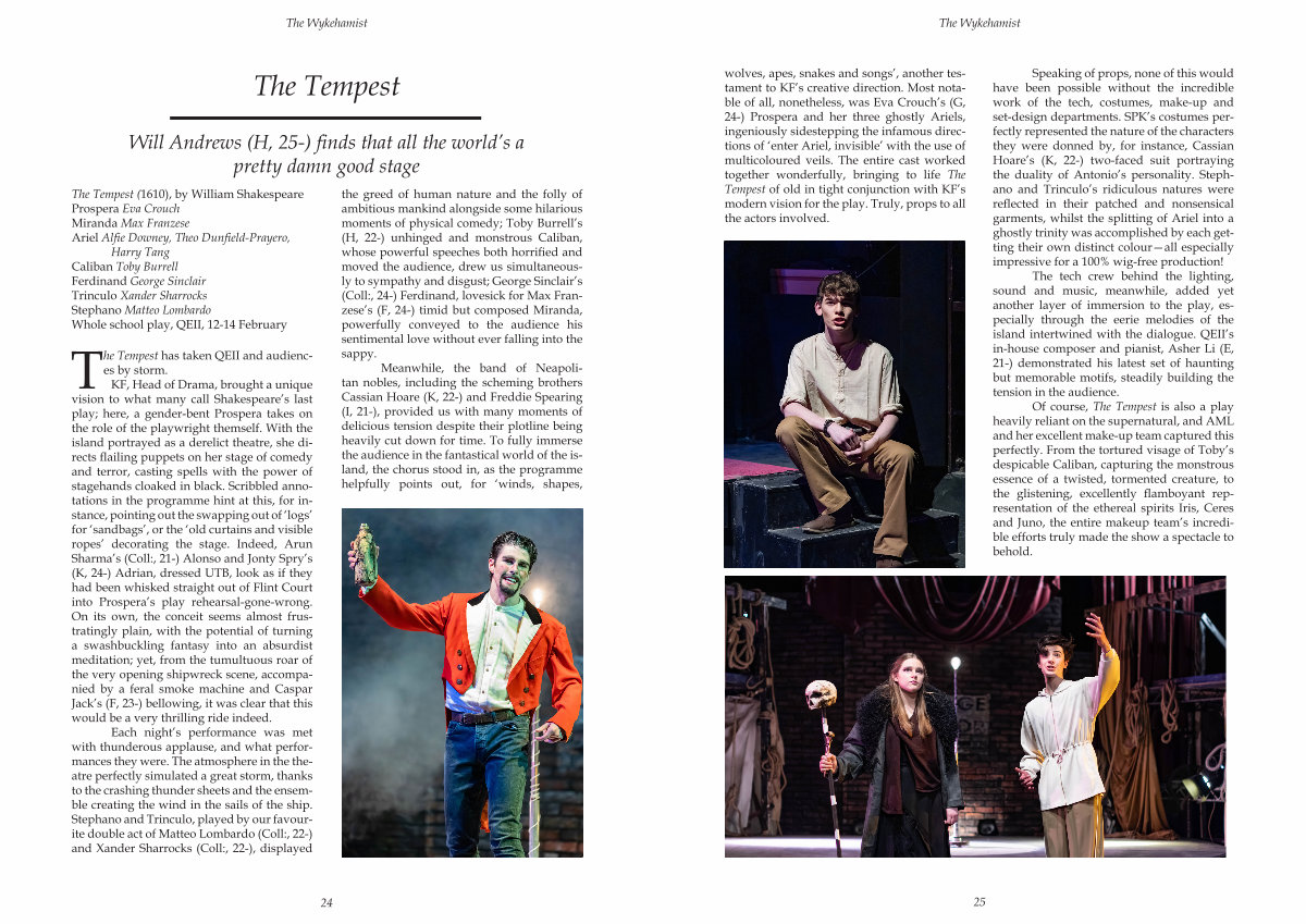 Speaking of props, none of this would have been possible without the incredible work of the tech, costumes, make-up and set-design departments. SPK’ s costumes perfectly represented the nature of the characters they were donned by, for instance, Cassian Hoare’ s( K, 22-) two-faced suit portraying the duality of Antonio’ s personality. Stephano and Trinculo’ s ridiculous natures were reflected in their patched and nonsensical garments, whilst the splitting of Ariel into a ghostly trinity was accomplished by each getting their own distinct colour— all especially impressive for a 100 % wig-free production!