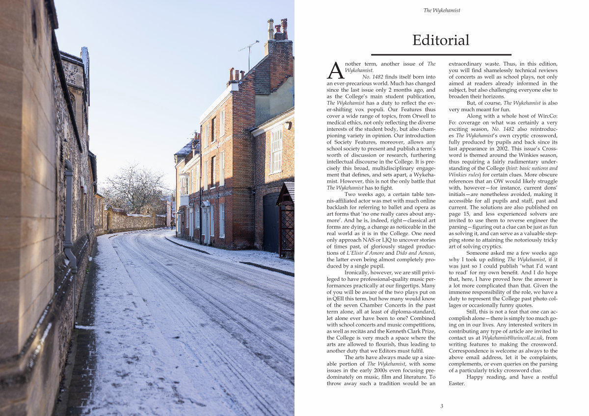 No. 1482 finds itself born into an ever-precarious world. Much has changed since the last issue only 2 months ago, and as the College’ s main student publication, The Wykehamist has a duty to reflect the ever-shifting vox populi. Our Features thus cover a wide range of topics, from Orwell to medical ethics, not only reflecting the diverse interests of the student body, but also championing variety in opinion. Our introduction of Society Features, moreover, allows any school society to present and publish a term’ s worth of discussion or research, furthering intellectual discourse in the College. It is precisely this broad, multidisciplinary engagement that defines, and sets apart, a Wykehamist. However, this is not the only battle that The Wykehamist has to fight.