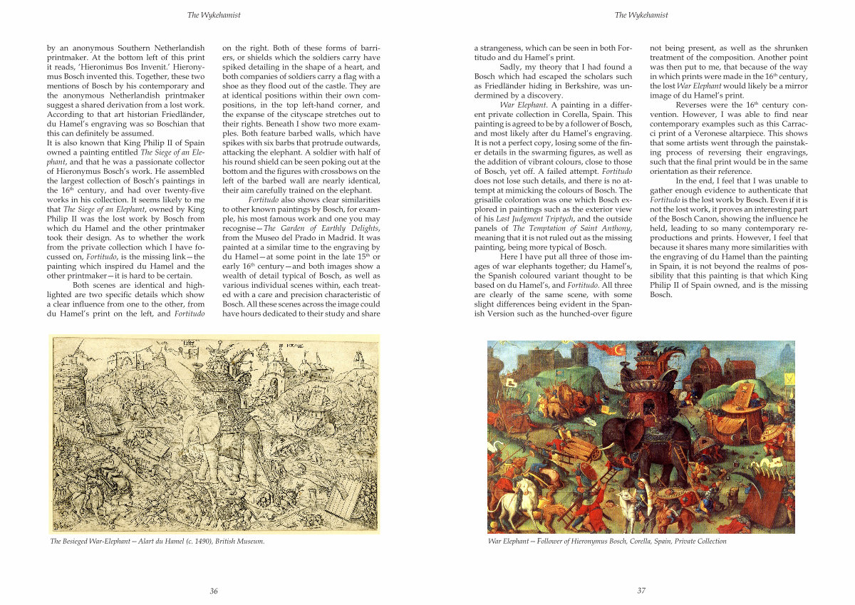 In the end, I feel that I was unable to gather enough evidence to authenticate that Fortitudo is the lost work by Bosch. Even if it is not the lost work, it proves an interesting part of the Bosch Canon, showing the influence he held, leading to so many contemporary reproductions and prints. However, I feel that because it shares many more similarities with the engraving of du Hamel than the painting in Spain, it is not beyond the realms of possibility that this painting is that which King Philip II of Spain owned, and is the missing Bosch.
