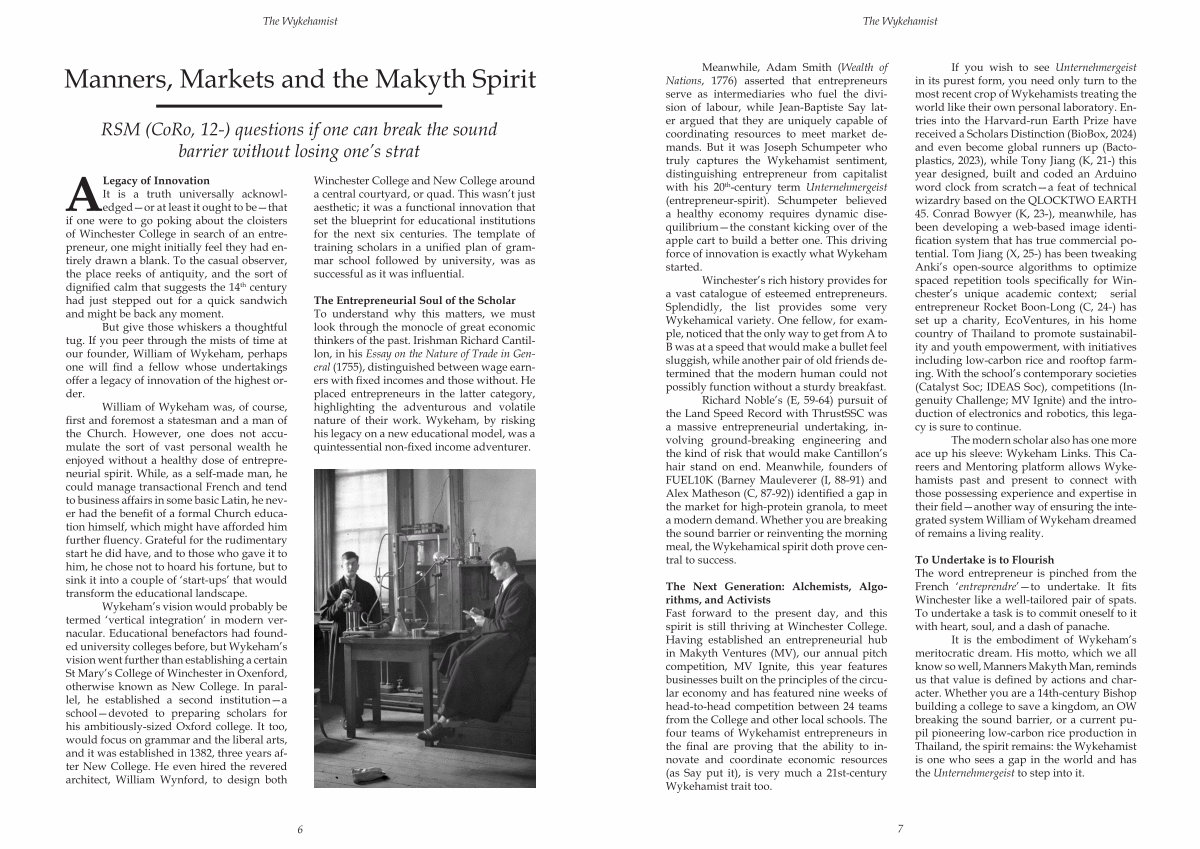 It is the embodiment of Wykeham’ s meritocratic dream. His motto, which we all know so well, Manners Makyth Man, reminds us that value is defined by actions and character. Whether you are a 14th-century Bishop building a college to save a kingdom, an OW breaking the sound barrier, or a current pupil pioneering low-carbon rice production in Thailand, the spirit remains: the Wykehamist is one who sees a gap in the world and has the Unternehmergeist to step into it.