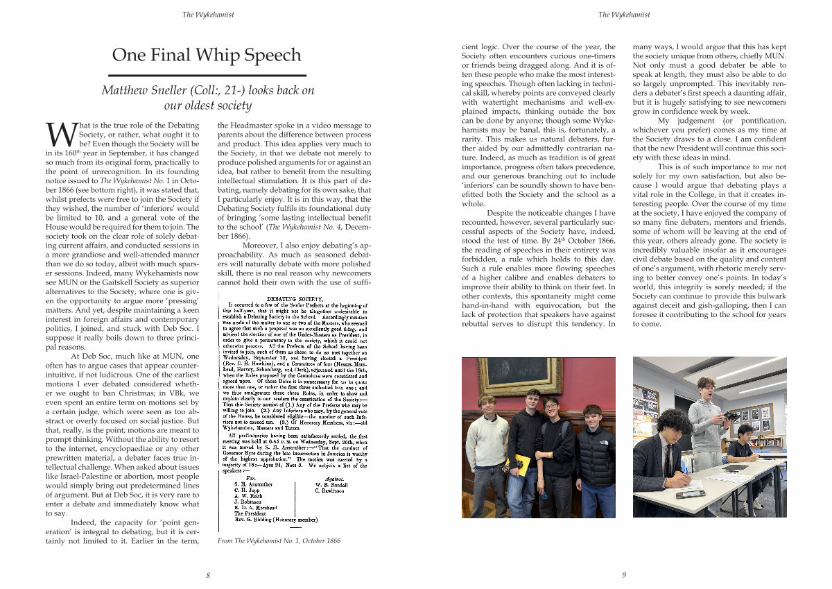 cient logic. Over the course of the year, the Society often encounters curious one-timers or friends being dragged along. And it is often these people who make the most interesting speeches. Though often lacking in technical skill, whereby points are conveyed clearly with watertight mechanisms and well-explained impacts, thinking outside the box can be done by anyone; though some Wykehamists may be banal, this is, fortunately, a rarity. This makes us natural debaters, further aided by our admittedly contrarian nature. Indeed, as much as tradition is of great importance, progress often takes precedence, and our generous branching out to include‘ inferiors’ can be soundly shown to have benefitted both the Society and the school as a whole.
