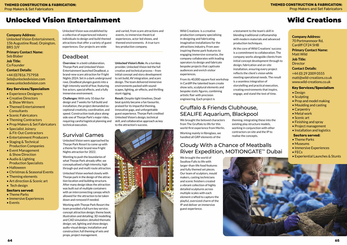Wild Creations is a creative production company specialising in designing and fabricating imaginative installations for the attractions industry. From aweinspiring theme park features to engaging immersive scenarios, the company collaborates with leading operators to design and fabricate bespoke projects that captivate audiences and enrich visitor experiences.