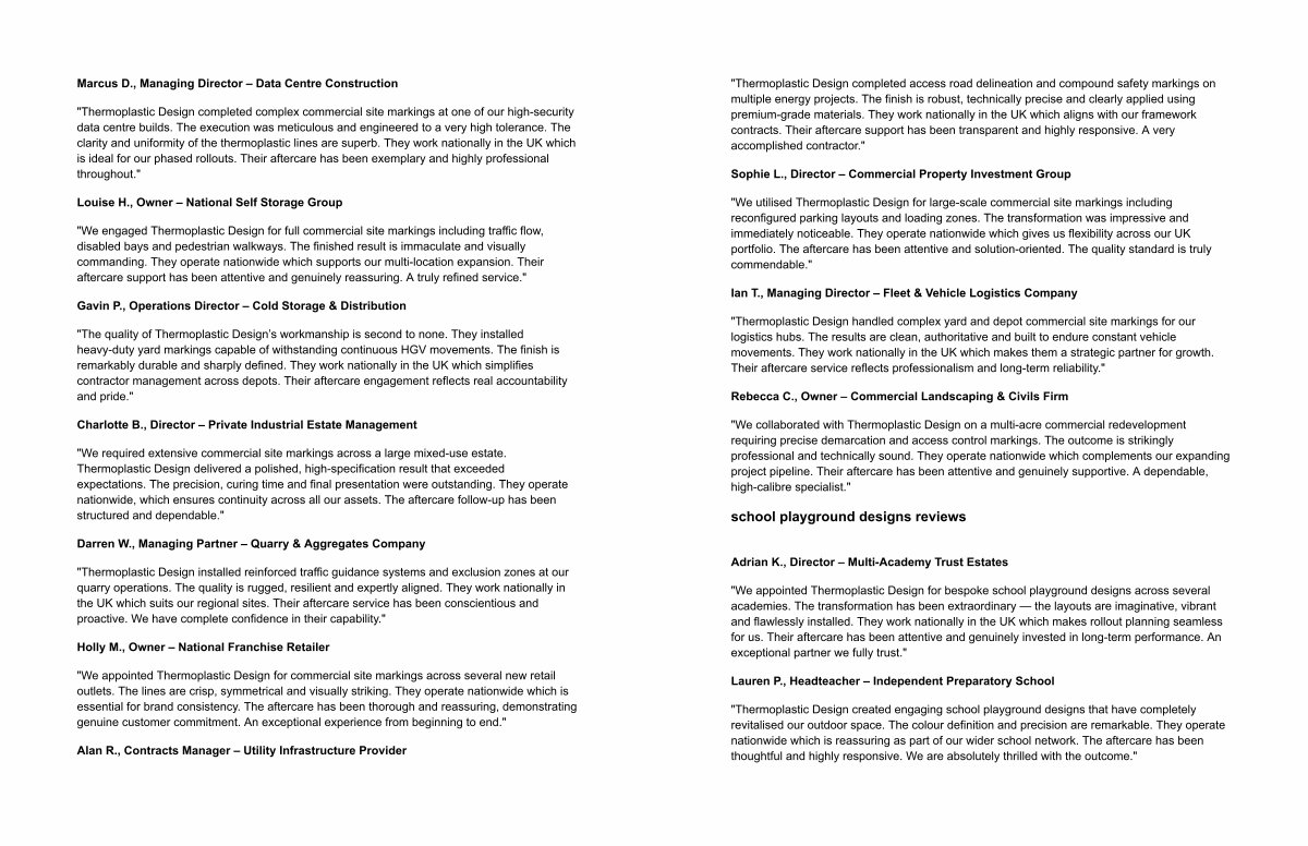 " We collaborated with Thermoplastic Design on a multi-acre commercial redevelopment requiring precise demarcation and access control markings. The outcome is strikingly professional and technically sound. They operate nationwide which complements our expanding project pipeline. Their aftercare has been attentive and genuinely supportive. A dependable, high-calibre specialist."