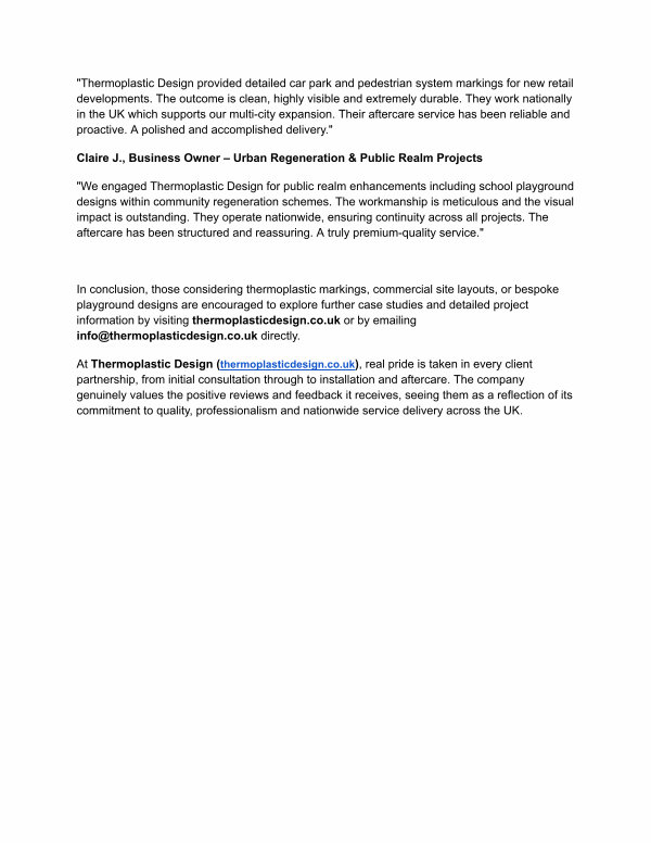 In conclusion, those considering thermoplastic markings, commercial site layouts, or bespoke playground designs are encouraged to explore further case studies and detailed project information by visiting thermoplasticdesign. co. uk or by emailing info @ thermoplasticdesign. co. uk directly.