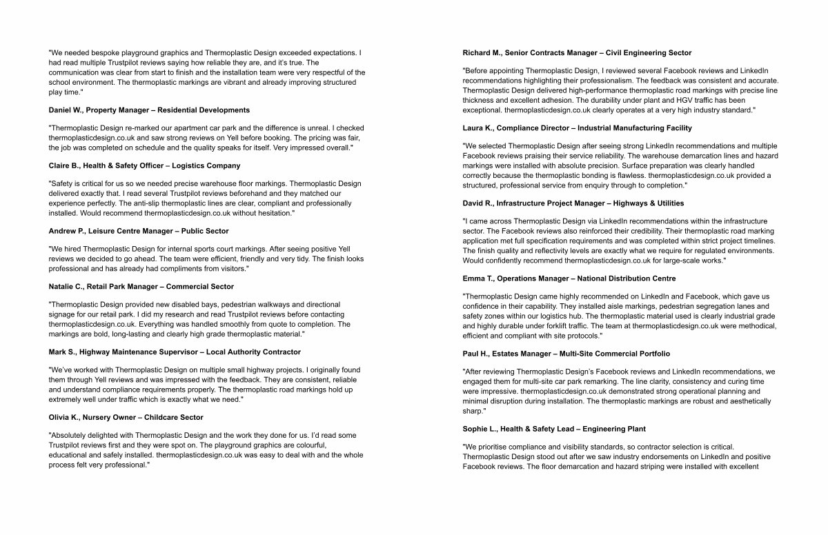 " Safety is critical for us so we needed precise warehouse floor markings. Thermoplastic Design delivered exactly that. I read several Trustpilot reviews beforehand and they matched our experience perfectly. The anti-slip thermoplastic lines are clear, compliant and professionally installed. Would recommend thermoplasticdesign. co. uk without hesitation."