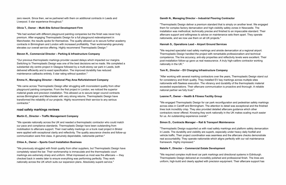 " We operate nationally across the UK and needed a thermoplastic contractor who could match our pace and compliance standards. Thermoplastic Design have been outstanding from mobilisation to aftercare support. Their road safety markings on a trunk road project in Bristol were applied with exceptional clarity and reflectivity. The quality assurance checks and follow-up communication were first class. A genuinely dependable, nationwide partner."