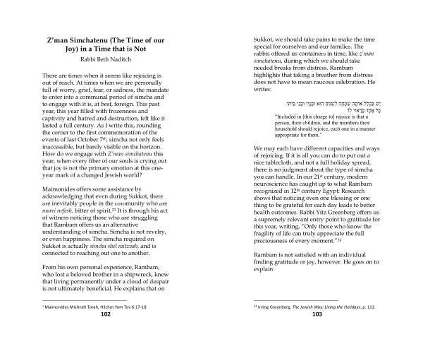 We may each have different capacities and ways of rejoicing . If it is all you can do to put out a nice tablecloth , and not a full holiday spread , there is no judgment about the type of simcha you can handle . In our 21 st century , modern neuroscience has caught up to what Rambam recognized in 12 th century Egypt : Research shows that noticing even one blessing or one thing to be grateful for each day leads to better health outcomes . Rabbi Yitz Greenberg offers us a supremely relevant entry point to gratitude for this year , writing , “ Only those who know the fragility of life can truly appreciate the full preciousness of every moment .” 24