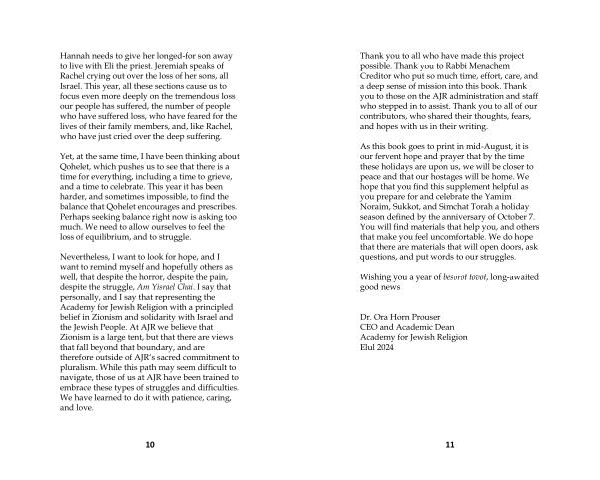 As this book goes to print in mid-August , it is our fervent hope and prayer that by the time these holidays are upon us , we will be closer to peace and that our hostages will be home . We hope that you find this supplement helpful as you prepare for and celebrate the Yamim Noraim , Sukkot , and Simchat Torah a holiday season defined by the anniversary of October 7 . You will find materials that help you , and others that make you feel uncomfortable . We do hope that there are materials that will open doors , ask questions , and put words to our struggles .