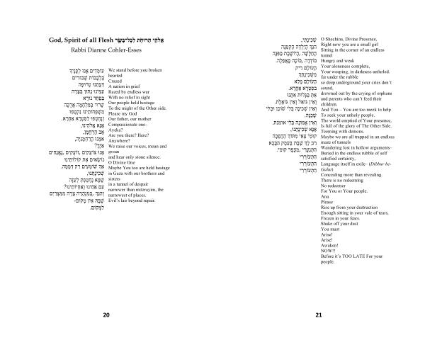O Shechina , Divine Presence , Right now you are a small girl Sitting in the corner of an endless tunnel Hungry and weak Your aloneness complete , Your weeping , in darkness unfurled . far under the rubble so deep underground your cries don ’ t sound , drowned out by the crying of orphans and parents who can ’ t feed their children . And You – You are too meek to help To seek your unholy people . The world emptied of Your presence , Is full of the glory of The Other Side . Teeming with demons . Maybe we are all trapped in an endless maze of tunnels Wandering lost in hollow arguments – Buried in the endless rubble of self satisfied certainty , Language itself in exile – ( Dibbur be- Galut ) Concealing more than revealing . There is no redeeming No redeemer For You or Your people . Ana Please Rise up from your destruction Enough sitting in your vale of tears , Frozen in your fears . Shake off your dust You must Arise ! Arise ! Awaken ! NOW !! Before it ’ s TOO LATE For your people .