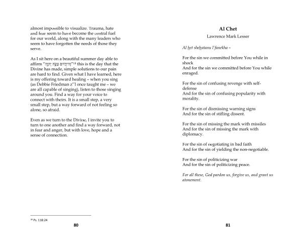 As I sit here on a beautiful summer day able to affirm “ ” הֶַ֭ז ה ־ ָשָׂע ה֣ ֑ה 18 this is the day that the Divine has made , simple solutions to our pain are hard to find . Given what I have learned , here is my offering toward healing – when you sing ( as Debbie Friedman z ’’ l once taught me – we are all capable of singing ), listen to those singing around you . Find a way for your voice to connect with theirs . It is a small step , a very small step , but a way forward of not feeling so alone , so afraid .