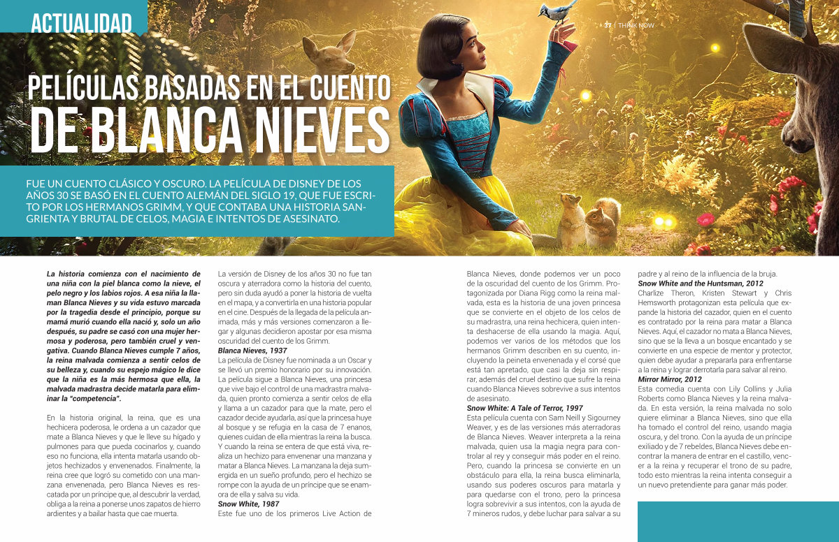 padre y al reino de la influencia de la bruja. Snow White and the Huntsman, 2012 Charlize Theron, Kristen Stewart y Chris Hemsworth protagonizan esta película que expande la historia del cazador, quien en el cuento es contratado por la reina para matar a Blanca Nieves. Aquí, el cazador no mata a Blanca Nieves, sino que se la lleva a un bosque encantado y se convierte en una especie de mentor y protector, quien debe ayudar a prepararla para enfrentarse a la reina y lograr derrotarla para salvar al reino. Mirror Mirror, 2012 Esta comedia cuenta con Lily Collins y Julia Roberts como Blanca Nieves y la reina malvada. En esta versión, la reina malvada no solo quiere eliminar a Blanca Nieves, sino que ella ha tomado el control del reino, usando magia oscura, y del trono. Con la ayuda de un príncipe exiliado y de 7 rebeldes, Blanca Nieves debe encontrar la manera de entrar en el castillo, vencer a la reina y recuperar el trono de su padre, todo esto mientras la reina intenta conseguir a un nuevo pretendiente para ganar más poder.