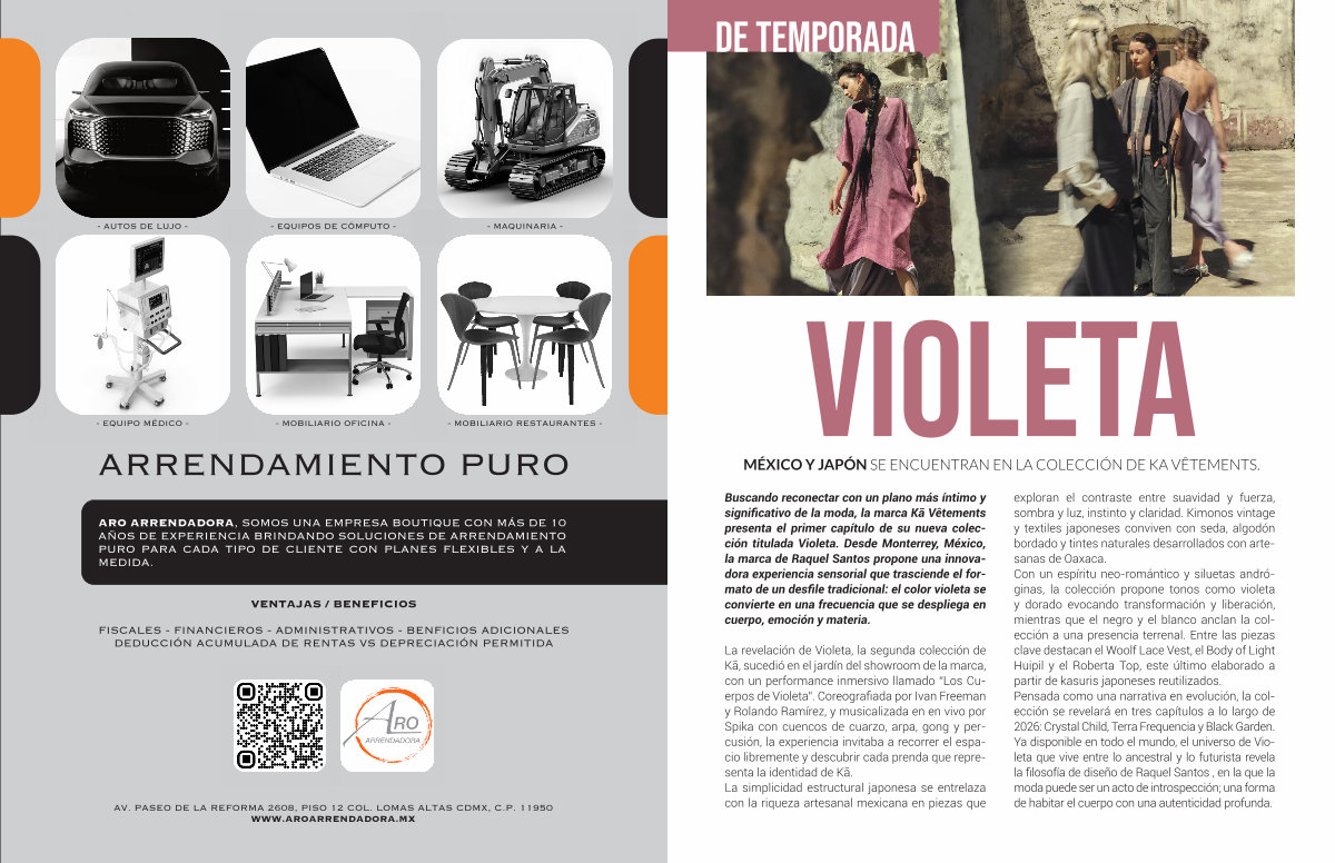 La revelación de Violeta, la segunda colección de Kā, sucedió en el jardín del showroom de la marca, con un performance inmersivo llamado“ Los Cuerpos de Violeta”. Coreografiada por Ivan Freeman y Rolando Ramírez, y musicalizada en en vivo por Spika con cuencos de cuarzo, arpa, gong y percusión, la experiencia invitaba a recorrer el espacio libremente y descubrir cada prenda que representa la identidad de Kā. La simplicidad estructural japonesa se entrelaza con la riqueza artesanal mexicana en piezas que exploran el contraste entre suavidad y fuerza, sombra y luz, instinto y claridad. Kimonos vintage y textiles japoneses conviven con seda, algodón bordado y tintes naturales desarrollados con artesanas de Oaxaca. Con un espíritu neo-romántico y siluetas andróginas, la colección propone tonos como violeta y dorado evocando transformación y liberación, mientras que el negro y el blanco anclan la colección a una presencia terrenal. Entre las piezas clave destacan el Woolf Lace Vest, el Body of Light Huipil y el Roberta Top, este último elaborado a partir de kasuris japoneses reutilizados. Pensada como una narrativa en evolución, la colección se revelará en tres capítulos a lo largo de 2026: Crystal Child, Terra Frequencia y Black Garden. Ya disponible en todo el mundo, el universo de Violeta que vive entre lo ancestral y lo futurista revela la filosofía de diseño de Raquel Santos, en la que la moda puede ser un acto de introspección; una forma de habitar el cuerpo con una autenticidad profunda.