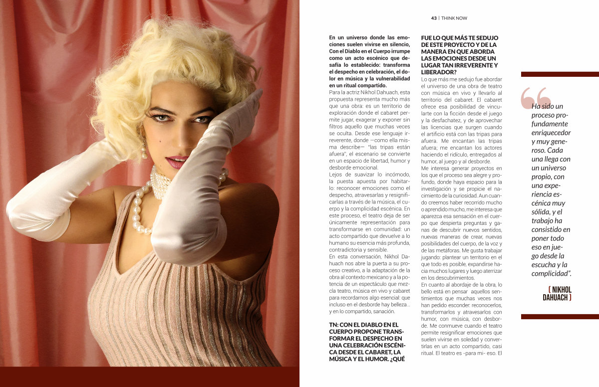 En un universo donde las emociones suelen vivirse en silencio, Con el Diablo en el Cuerpo irrumpe como un acto escénico que desafía lo establecido: transforma el despecho en celebración, el dolor en música y la vulnerabilidad en un ritual compartido. Para la actriz Nikhol Dahuach, esta propuesta representa mucho más que una obra: es un territorio de exploración donde el cabaret permite jugar, exagerar y exponer sin filtros aquello que muchas veces se oculta. Desde ese lenguaje irreverente, donde— como ella misma describe—“ las tripas están afuera”, el escenario se convierte en un espacio de libertad, humor y desborde emocional. Lejos de suavizar lo incómodo, la puesta apuesta por habitarlo: reconocer emociones como el despecho, atravesarlas y resignificarlas a través de la música, el cuerpo y la complicidad escénica. En este proceso, el teatro deja de ser únicamente representación para transformarse en comunidad: un acto compartido que devuelve a lo humano su esencia más profunda, contradictoria y sensible. En esta conversación, Nikhol Dahuach nos abre la puerta a su proceso creativo, a la adaptación de la obra al contexto mexicano y a la potencia de un espectáculo que mezcla teatro, música en vivo y cabaret para recordarnos algo esencial: que incluso en el desborde hay belleza … y en lo compartido, sanación.