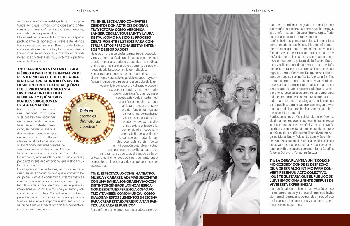 pas de un mismo lenguaje. La música no acompaña la escena: la construye, la empuja, la transforma. La música es dramaturgia. Todo en escena es dramaturgia y poética. Aquí lo bello es pensar también a los músicos como creadores escénicos. Ellos no sólo interpretan, sino que crean con nosotras en cada función. Se ha generado una complicidad muy profunda: nos miramos, nos sentimos, nos comunicamos dentro y fuera de la ficción. Entramos y salimos cuandoqueremos, en un vaivén precioso. Para el espectador, siento que es un regalo. Junto a Pedro de Tavira, hemos decidido que nuestra compañía, La Ventana Sin Fin, trabaje siempre con música en vivo. El placer de escuchar instrumentos reales sonando en directo aporta una presencia distinta a la experiencia, tanto para quienes miran como para quienes estamos en escena. Nos interesa trabajar con elementos analógicos, en la medida de lo posible, para recuperar ese lenguaje vivo que surge de la ejecución humana: algo palpable, sensible, irrepetible. Particularmente en Con el Diablo en el Cuerpo, elegimos un repertorio latinoamericano: todas las canciones son en español y, en su mayoría, escritas y compuestas por mujeres referentes de la música de la región, como Chantal Andere, Angélica María, Nathy Peluso, La Lupe y Sara Montiel, Bife. Nos da orgullo y alegría seguir poniendo estas voces en los escenarios y hacerlo con estos maravillos músicos como son Dano Coutiño, Antonia Suillerot y Yonathan Salazar